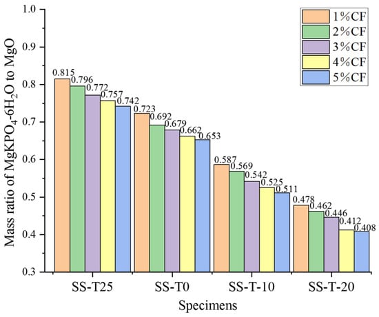 Mass ratio of MgKPO4-6H2O to MgO under different curing temperatures and CF contents.