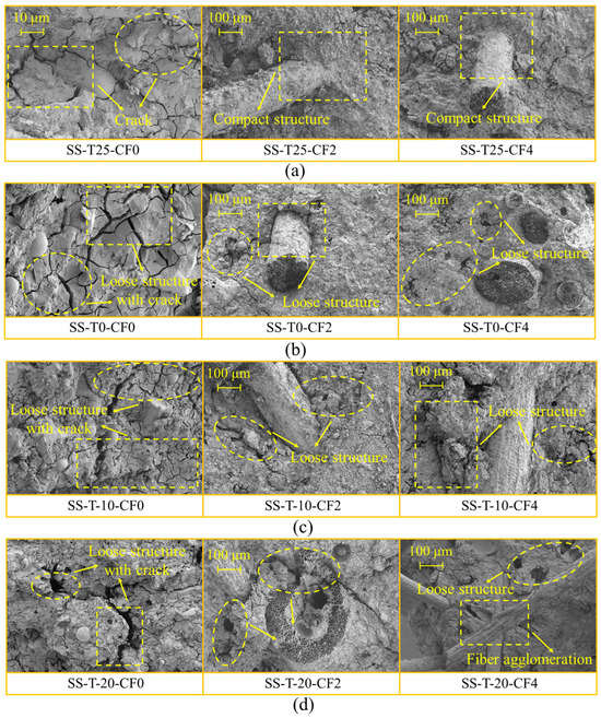 Figure 10 shows the SEM of the CF-MPC at various curing temperatures, whereas Figure 10a displays the microstructure of the CF-MPC at 25 °C. It can be found that the specimen still produced small cracks, but the overall number of cracks and the crack widths were smaller, and the structure was denser. At this time, the hydration of the CF-MPC was more complete, generating more of the main product, MgKPO4-6H2O. With the decrease of the curing temperature to 0 °C, 10 °C, and 20 °C, the wider distribution of MPC cracks and the larger width of cracks can be seen in Figure 10b–d, which was because, at low temperatures, the water inside the MPC gradually crystallized and expanded to the internal pores to destroy the internal structure of the MPC. Moreover, with the lowering of the curing temperature, the slower and more incomplete hydration rate of the MPC led to the more rapid inward extension and growth of MPC microcracks, and the structure was looser, which was in line with the findings of the XRD hydration product analysis. In addition, with the increase of CF content, CF appeared in the agglomeration phenomenon so that the pore space of CF-MPC increased, and the structure was less dense, to a certain extent, weakening the CF-MPC.