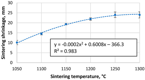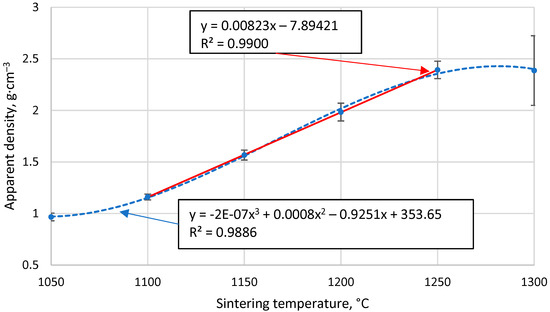 However, in the temperature range 1100 °C to 1250 °C, there is a marked linear increase in density with sintering temperature, as shown in Figure 5, giving R2 = 0.99 and a regression line function ρ = 0.0082x − 7.89 for the linear regression analysis. This means that over this temperature range and under these sintering conditions, it is possible to reliably predict the apparent density of the resulting materials by knowing their sintering temperature.