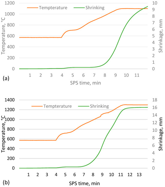 Analysis of the sintering process data shown in Figure 3a,b shows that at the lower sintering temperatures, the process is stopped before the shrinkage of the sample is complete, i.e., the particles are fully sintered. In comparison, at higher temperatures, the shrinkage stops briefly after the sintering temperature is reached. This can be explained by the softening of the CS caused by the increased sintering temperature, which allows the sample to reach equilibrium more quickly at the same compression force on the sample.