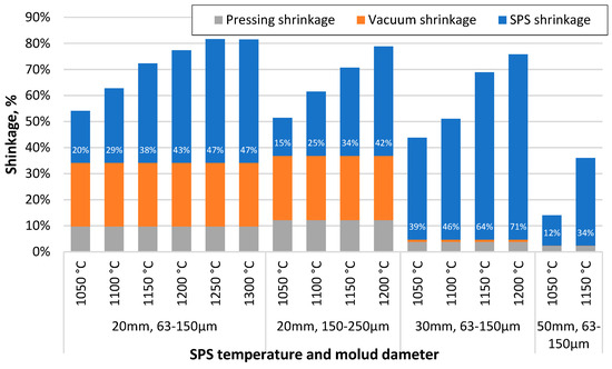 Comparing the shrinkage of the samples at different stages of the sample creation process, some peculiarities can be observed. Figure 4 shows that the samples formed from the 150–250 µm CS fraction have less shrinkage during the SPS process at lower sintering temperatures, but this difference decreases with increasing sintering temperature. The higher wall thickness of the particles can potentially explain this difference. In contrast, as the temperature increases and the particles become soft under its influence, the effect of the thicker walls in increasing their mechanical strength becomes negligible. The specimens sintered in the 30 mm moulds have reduced shrinkage during pressing and vacuum due to the lower pressure on the surface of these specimens due to their larger diameter. However, their shrinkage during sintering is significantly higher, probably due to the breakage or deformation of previously unbroken particles at elevated temperatures, in contrast to the samples sintered in the 50 mm moulds, where the pressure is even lower.