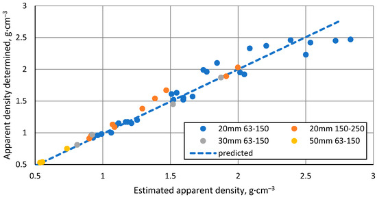 An important observation is that when looking at the whole set of samples produced and the individual batches, there is no linear relationship between the shrinkage of the samples and their apparent density, as would be expected from the formula for calculating the apparent density. Therefore, instead of estimating this relationship, it is possible to do so for the relationship between the measured apparent density and the predicted apparent density based on the observed sample shrinkage.