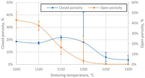 The closed porosity of the sintered materials peaks in the sintering temperature region between 1100 °C and 1200 °C, as shown in Figure 7. This can be explained by the significant difference in the rate of closed and open pore volume reduction in this temperature region, as shown in Figure 8, where it can be observed that the closed pore volume reduction rate is highest in the temperature region between 1150 °C and 1250 °C, as opposed to 1100 °C and 1150 °C for open pores. This means it is possible to produce CS ceramics with a specific ratio of open to closed pore volumes if required (Figure 8).