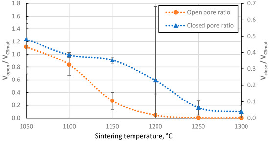 The ratio of closed and open pore volumes of sintered CS 63–150 µm samples to the volume of CS material volume (aluminosilicate only, excluding voids) as a function of sintering temperature.