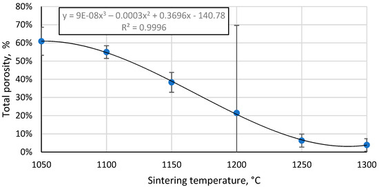 The total porosity of the sintered samples decreases with increasing sintering temperature (Figure 9), and there is a strongly linear decrease between 1100 °C and 1250 °C, as would be expected with the linear increase in the apparent density of these samples in this temperature range, since total porosity and apparent density are correlated values. Moreover, this indicates that no gross errors were obtained during the porosity determination.