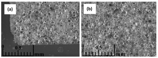 Concrete and ceramic matrices of SF, of course, are known and studied [16,17], but the influence of high temperatures on such materials also leads to its decomposition (concrete) and melting (glass softening temperature 550–650 °C). The necessity of new SF foam arises from its unique combination of properties, including buoyancy, high strength-to-weight ratio, thermal insulation, chemical resistance, and customizable characteristics. These features make syntactic foam a valuable material in industries such as marine engineering, aerospace, defence and underwater exploration. One of the promising components of SF are cenospheres (CS). A substantial quantity of ash, containing CS, is formed during coal combustion, which can then be processed using various methods to extract these particles. The separation of CS from the ash contributes to a reduction in waste produced by thermal power stations [18]. It offers an opportunity to harness these unique ceramic particles for composite material development. CS, derived from coal combustion residues, are available at a low cost as a component of fly ash from coal-fired power plants. They are characterised as chemically inert and resistant to high temperatures, making them a successful type of hollow ceramic microbead for use as filler particles. These CS have proven suitability, even in high-temperature processes [19]. The apparent density of CS ranges from 0.4 to 0.8 g·cm−3, although depending on the definition, i.e., whether CS are described as particles with an apparent density below that of water or as hollow particles, the maximum density will approach that of a solid ash particle, i.e., about 2.0–2.6 g·cm−3 [20]. This lower density is due to the gas bubble trapped in the centre of the particles, which has a composition similar to that of flue gases, and also the fact that for different particle sizes, the ratio of diameter to wall thickness is constant at around 20–30 [21]. The diameter of the CS ranges from 5 µm to over 600 µm, although most of the particles are between 20 µm and 300 µm in diameter [22].