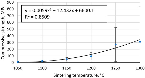 All tested specimens are brittle, i.e., their collapse occurs spontaneously and is not preceded by the formation of large cracks in the specimens or deformation. However, small pieces of ceramic were, in some cases, detached from the samples and sintered at the highest temperatures before destruction due to insufficient homogeneity of the samples or the inhomogeneous contact surface between the sample and the testing apparatus. Figure 12 shows that the compressive strength of the samples increases with increasing sintering temperature, the most likely explanation being a combination of two effects. Firstly, higher binding between the CS particles, an effect that would be more pronounced at lower sintering temperatures where this binding between the particles is relatively weak, and secondly, the relationship between the density of the high-porosity materials and their mechanical strength.