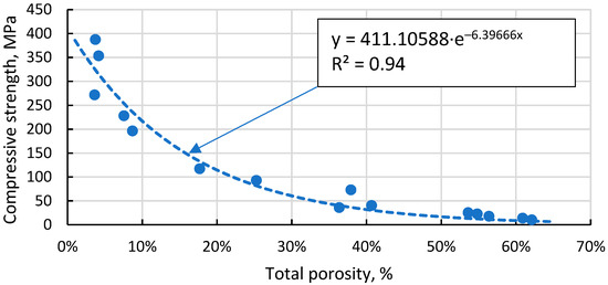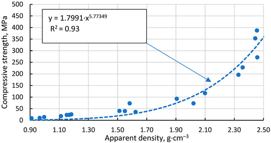 The Gibson–Ashby model for predicting the properties of lattice type and porous materials [46], which is reducible to a power function, does not allow a conclusive correlation between the compressive strength results obtained for the specimens, giving R2 = 0.93 (Figure 13). An additional problem is the lack of reliable data on which to base the compressive strength and density of a fully compacted, sintered cenospheric sample. This means that the model cannot be used in this case. The model suggested by Rice [47] gives a visually and mathematically better agreement with R2 = 0.94 (Figure 14). In addition, this model also gives a reliable value for the compressive strength of a dense material, σs = 411.1 MPa since, as mentioned above, these values are not known.