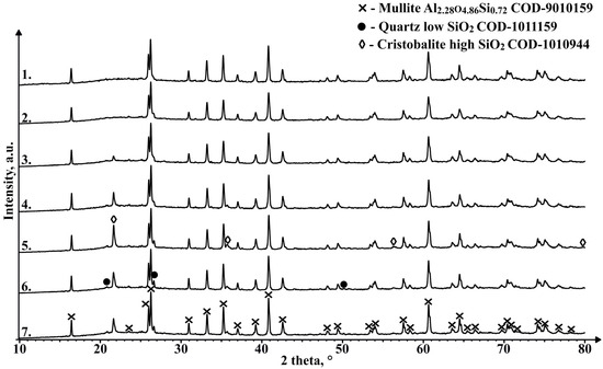 XRD image acquisition and qualitative analysis of the unsintered material and sintered samples was performed using D8 Advance (Bruker, Billerica, MA, USA), with a copper anode X-ray tube (40 kV voltage and 40 mA current). Diffraction images were taken between 10° and 80° 2θ, as a locked-coupled scan at a scan rate of 0.15° 2θ min−1 and a data registration step of 0.02° 2θ. The crystalline phases observed in the diffraction patterns were analysed using Diffrac.EVA 6.1 data processing software and the electronic COD (Crystallography Open Database) database. Diffraction image preparation was performed using Diffrac.EVA software to perform Fourier smoothing for the scans and to position them, and used GIMP version 2.10.34 to thicken the lines and add phase markers and scan numbers.