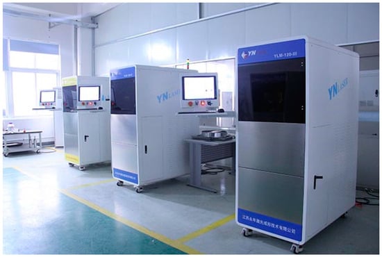 The SLM machine used in this work was provided by Jiangsu Yongnian Laser Forming Technology Co., Ltd. (Kunshan, China) and the product of this instrument was YLM-120 which is shown in Figure 2. The laser device used in this instrument was SPI redPOWER fiber type laser while the wavelength was 1060 nm. The minimum size of the laser spot was 40 nm. The scan system used in this instrument was high-speed scan galvanometer with F-theta optical lens and the highest scan speed was 7000 mm/s. The detailed information about the process parameters is shown in Table 2.