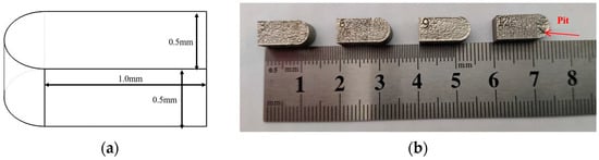 Hatch spacing, which is the distance between scan lines, was the only variable parameter in this work and the detailed information is shown in Table 3. The detailed explanation about hatch spacing is shown in Figure 3. The design sketch and the printed samples in this work are shown in Figure 4a,b, respectively.