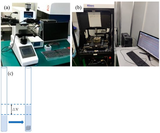 As for the instruments used for testing, two main instruments were employed in this work. One is the semi-automatic digital microhardness tester provided by Shanghai Suoyan Testing Instrument Co., Ltd., Shanghai, China, and its model was HVS-1000ZCM-XYY to test the microhardness value of the printed parts. The wear resistance was tested using the reciprocating friction and wear testing machine provided by RTEC, San Jose, CA, USA, and the model was MFT-5000. As for the porous density of the printed sample, it was mainly measured using the Archimedean Drainage method. All the testing instruments and schematic diagram of Archimedean Drainage method are shown in Figure 5.