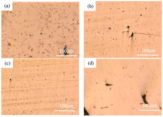 The morphology of the sample printed using 0.02 mm (a), 0.04 mm (b), 0.06 mm (c), and 0.08 mm (d), respectively, after polishing.