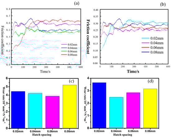 To sum it up, hatch spacing had a significant impact on the overlapping ratio under the same spot size, and the performance of the molten pool in the overlapping zone showed a different impact under different overlapping ratios. An unsuitable hatch spacing likely led to the formation of the extra voids in this process which caused the decrease in the microhardness and wear resistance in a solid-state atmosphere. However, wear resistance in liquid-state atmosphere showed a different variation trend due to the fact that some voids on the surface can provide a lubrication effect while too many voids or too large voids also decrease the wear resistance even in the liquid-state atmosphere.
