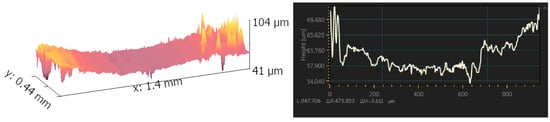 This phenomenon was quite different from the results gained before. It was mainly caused by the lubrication effect of the liquid stored inside the voids on the surface. When the grinding ball squeezed the surface in the friction process, the liquid inside the voids squeezed out and acted as lubricant. It can, of course, increase the wear resistance of the printed parts. However, when the size and amount of voids went too high, it also had a significant negative impact on the wear resistance of the printed part. One reason is the loose state of the printed part when too many voids formed in this process. Another reason is that the edge of the voids with a relatively large size was more likely impacted by the grinding ball which resulted in the extra removal of the material. Morphology of the surface after grinding is shown in Figure 13. It can be seen that a furrow-shaped scratch was quite clear in this image and the depth of the scratch also confirmed the observation before.