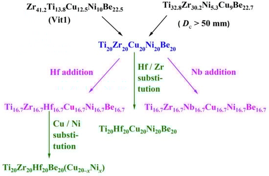 - Takeuchi, A. Alloy designs for high-entropy alloys, bulk metallic glasses and high-entropy bulk metallic glasses. J. Jpn. Inst. Met. Mater. 2015, 79, 157–168. [Google Scholar] [CrossRef]