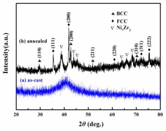 - Yim, H.C.; Xu, D.H.; Johnson, W.L. Ni-based bulk metallic glass formation in the Ni-Nb-Sn and Ni-Nb–Sn-X (X=B,Fe,Cu) alloy systems. Appl. Phys. Lett. 2003, 82, 1030–1032. [Google Scholar] [CrossRef]
