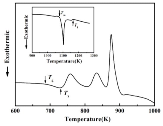 - Zhang, T.; Inoue, A.; Masumoto, T. Amorphous Zr-Al-TM (TM=Co, Ni, Cu) alloys with significant supercooled liquid region of over 100 K. Mater. Trans. JIM 1991, 32, 1005–1010. [Google Scholar] [CrossRef]