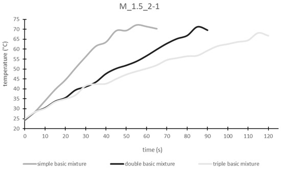 Moreover, the influence of the sample weight on temperature development was studied. For this, sample M_1.5_2-1 was selected as an example. It was mixed according to the mass proportions of the components in three different gradations (simple basic mixture (33 g) to triple basic mixture (99 g)). The measurement of the temperature was performed as described above. At the end of all measurements, samples were hardened.