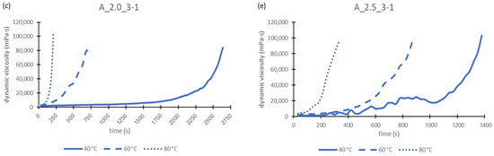 For this investigation, all geopolymer pastes were considered, except M_2.5_2-1 as this one reacts very slowly, as could be observed in pretests. The aim was to observe the starting point of structural formation. Measurement took place at 40 °C, 60 °C and 80 °C for each mixture. The geopolymer paste A_1.5_2-1 could not be investigated at 80 °C. Because during the 60 °C measurement the paste had already cured after 90 s, it was assumed that this happens even faster at higher temperatures. Therefore, the 80 °C measurement was omitted for this geopolymer paste, in order not to damage the instrument and to prevent the hardened geopolymer paste from not being removed from the measuring cell. This decision is also confirmed by the fact that with sample A_2.0_2-1 at 80 °C, hardening occurred after just 90 s and the measurement stopped (Figure 4b). With a higher alkalinity of the sodium silicate solution the curing might be accelerated.