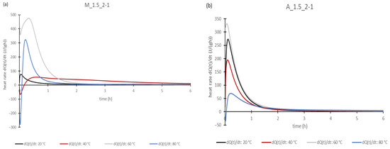 Heat rates of the geopolymer pastes: M_1.5_2-1 (a) and A-1.5_2-1 (b).