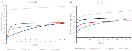 Heat quantities of the geopolymer pastes: M_1.5_2-1 (a) and A_1.5_2-1 (b).
