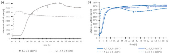 Figure 7 shows the results of the ultrasonic transit time measurement, where the measurement at 25 °C is shown as solid lines and at 60 °C as dashed lines. When the material begins to solidify, the ultrasonic velocity increases because the formation of the structure and the associated formation of solid phases improve the transmission of ultrasound. As soon as the velocity no longer changes significantly the material is completely hardened.
