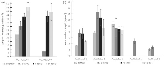As can be seen in Figure 8a, for metakaolin-based geopolymer mortars, the compressive strength obtained by curing at an ambient temperature was greater than that for samples cured using the microwave treatment. With the increasing age of the samples, the compressive strength increases. The greatest strength was achieved with the mixture M_1.5_S_2-1. After 7 days the microwave-treated samples reached a compressive strength of 32 MPa. The samples at the same age which had been stored at ambient temperature reached a compressive strength of 42 MPa. So, it can be assumed that through the faster evaporation of water the geopolymerization reaction changed. Water is not available long enough to be released stepwise by the passing condensation reaction, but evaporates too quickly. This has an impact on the geopolymer network, which cannot be built well and so the compressive strength decreases compared to that of the samples cured at ambient temperature.