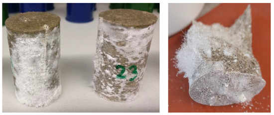 In the aluminum orthophosphate-based geopolymer samples, agglomerates of unreacted aluminum orthophosphate were visible. Therefore, aluminum orthophosphate was not completely dissolved by the sodium silicate solutions and reacted incompletely. Some traits of an incomplete dissolution of aluminum orthophosphate in sodium silicate solution were also found by Partschefeld et al. [8]. Lagno et al. investigated the solubility of hydrated aluminum phosphate (AlPO4 × 1.5 H2O) at 22 °C at different pH values. The results showed that when the pH is over 4.0 the solution of hydrated aluminum phosphate becomes incongruent [43]. So, because the pH value of the geopolymer solutions is about 8 or higher (compare Table 9), the solution of the aluminum orthophosphate might be incomplete, leading to the formation of agglomerates. For the Si/Al value of 3/1 perhaps the lower content of aluminum orthophosphate cannot be dissolved completely due to agglomeration, and the small amount that is dissolved in the sodium silicate solution does not suffice to form a stabile geopolymer network. This was demonstrated by the salt efflorescence of the geopolymer samples (Figure 9), which showed after a few days, regardless of the sodium silicate solution that was used.
