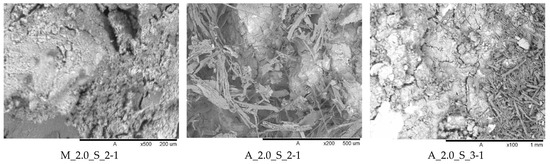 Because there were no obvious differences between the activators used, Figure 10 shows only the mortars activated with the sodium silicate solution with a modulus of 2.0. As can be seen for the metakaolin geopolymer mortars, the microstructure seems to be more homogeneous than for the aluminum orthophosphate-based mortars. Also, for both A_2.0_S samples needle-shaped salt efflorescence is recognizable. This topic was mentioned above. There is no significant visible difference between the two different Si/Al ratios. The different surface structures are the result of the different raw materials used.