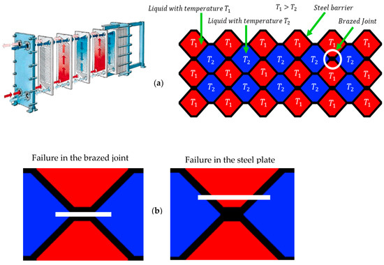 Schematic presentation of the brazed plate heat exchanger (a) and different types of failure (b).