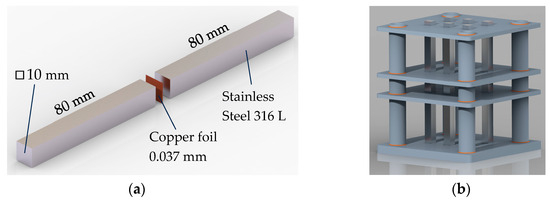 In this study, stainless steel 316L was used as a plate material (see Table 1). Copper was used as a connecting material, which connects plates together inside the heat exchanger. When preparing the specimens for quasi-static and fatigue tests, two bars made of stainless steel were vacuum brazed using a copper foil with a thickness of 0.037 mm (see Figure 2) made of pure copper (99.99%). The complete procedure of vacuum braising consisted of six stages (vacuuming, heating, solidification, slow cooling, fast cooling and room pressure). At the copper solidification temperature (≈1150 °C), the austenitic stainless steel came into the recrystallisation zone. To mitigate the level of recrystallisation and, consequently, the mechanical properties changes, the time of the solidification phases must be shortened as much as possible, which depends on the wettability and capillarity between copper and austenitic stainless steel, the geometry of the brazing area, etc.