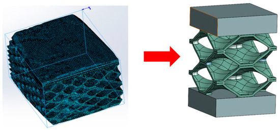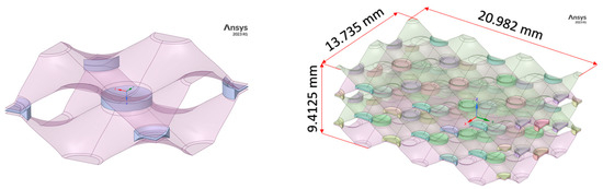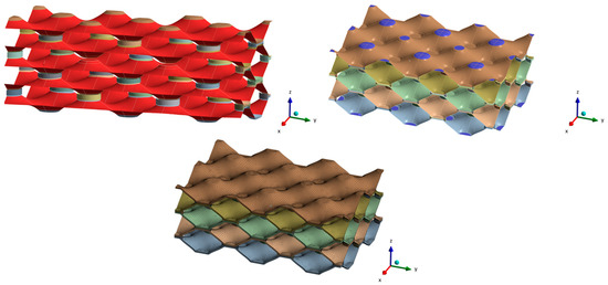 As mentioned above, the aim of the research was to investigate the influence of non-brazed joints on the lifetime of the heat exchanger. With the desire to investigate as large an area as possible, a hybrid “solid-surface” model was created, where the brazed joints were dimensioned as solid models, and the geometry of the “honeycomb” was in the form of a surface model. Thus, a hybrid solid-surface geometry was created, which was then extended and parameterised. Figure 4 shows the unit cell and parametric model which was used for the subsequent numerical analysis.