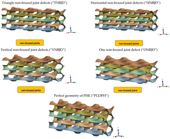 - The computational results have shown that individual defects (i.e., non-brazed joints) significantly influence the displacement and stress distribution near these defects. Namely, each non-brazed joint increases the stress field around the surrounding brazed joints, which leads to a shorter fatigue life of the whole structure of PHE;