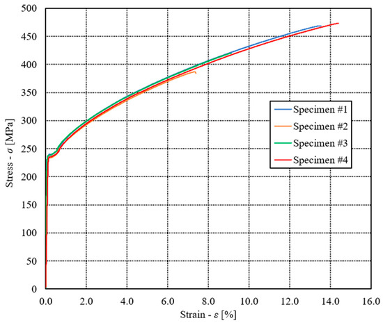Figure 7 shows the engineering diagram σ − ε of quasi-static tests. Taking into account all the experimental results for all four tested specimens, it follows the following average values: Young’s modulus E = 198,387 MPa, Poisson’s ratio ν = 0.28, Yield stress Re = 237 MPa, ultimate tensile stress Rm = 437 MPa and elongation at break EL = 11.1%. It is clear that due to the very thin layer of copper foil (0.037 mm), the specimen’s stiffness is defined by the mechanical properties of stainless steel 316L.