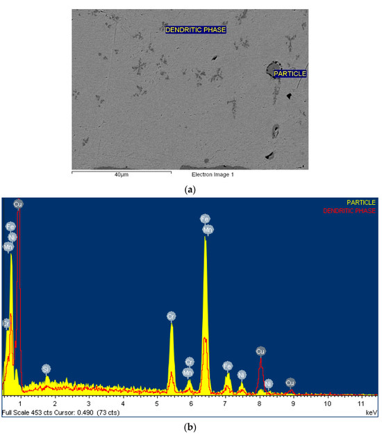 Figure 8 shows the SEM images of the fracture surface of a tensile specimen. The fracture has the characteristics of a ductile fracture. The dimples were evenly distributed over the entire fractured surface. It seems that they nucleated at intermetallic particles. Microchemical EDS analysis (see Figure 9) revealed the presence of particles in the remains of the broken Cu foil. In addition to the dendritic phase formed in the Cu matrix and containing the elements Cu, Fe, Cr, Mn, Si and Ni, irregularly shaped particles containing the elements Fe, Cr, Mn, Si and Ni and originating from the stainless steel substrate were also present.