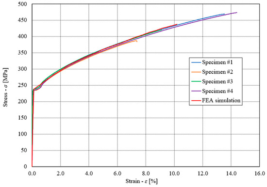 The experimental results of quasi-static tensile tests (see Figure 7) were then considered to create the material model of the analysed brazed joint, which was used for the subsequent computational analyses of the plate heat exchanger (see Section 3.3). The numerical modelling of the analysed brazed joints was performed using the Ansys software, where the simplified geometry of the brazed joint specimen was applied for that purpose. In this case, the numerical model was built as a solid homogeneous piece of the material with the same cross-section area as already used in the experimental testing (see Figure 2). However, only the measuring length of the specimen (i.e., 50 mm) was considered for the subsequent numerical computations. Figure 10 shows the comparison between experimental and computational results for the engineering diagram σ − ε. It is evident that for all considered experimental tests, yield stress was around 237 MPa, which corresponds to the numerical simulations. In the elastic area (below yield stress), a very good match between experimental and numerical results was observed.