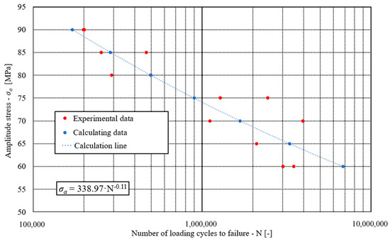 Fatigue tests have been performed on the same machine as quasi-static tests (Zwich/Roel Vibrophore-100, ZwickRoell, Ulm, Germany) using the same specimens (see Figure 2). The fatigue tests were performed at a room temperature of 20 °C under a loading ratio R = 0.1 and a loading frequency of approximately 98 Hz. All tests were performed in the high cycle fatigue regime (HCF), which means that the maximum stress in each loading cycle did not exceed the yield stress of the analysed brazed joint (i.e., Re = 237 MPa). Following this limitation, the maximal tensile stress between (0.6 … 0.8)·Re was selected. Figure 11 shows the S − N plot of fatigue tests where amplitude stress σa is given on the ordinate axis.