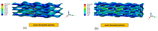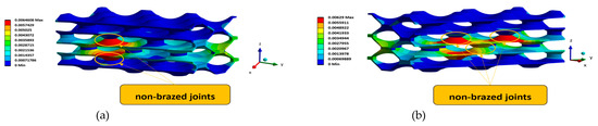 Figure 13 shows the von Mises equivalent stress in the analysed PHE structures for the two most critical configurations: VNBJD and TNBJD. In general, the parametric computational analyses have shown that the equivalent stress increases with the increase in the number of non-brazed joints, which confirms the thesis of load transfer to adjacent welded joints in the case of the presence of defects.