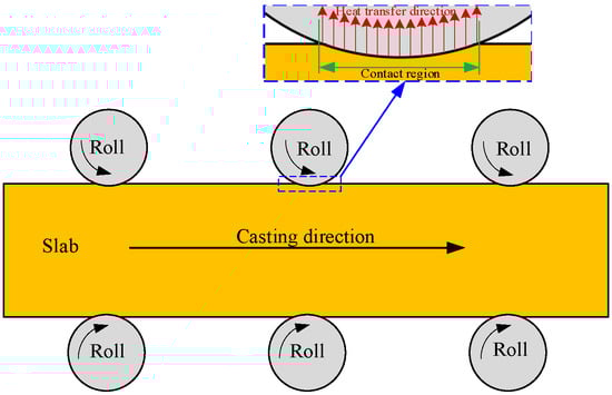 Roll contact (shown in Figure 1), as one of the main cooling methods after the mold, removes about 10% [] of the heat of the casting steel and thus significantly influences the heat transfer of the continuously cast steel. In the previous works, two main calculation methods were adopted to deal with the cooling boundary condition between rolls and strand in the numerical study of the strand heat transfer behavior: the equivalent roll contact method (E. method) and the real roll contact method (R. method). For the E. method [,,], all the heat extracted via roll contact is regarded as a uniformly releasing process along the casting direction, and for the R. method [,,], the cooling boundary condition for roll contact is applied in each roll–slab contact region. For the numerical calculation process of heat transfer using the R. method, the calculation time step should be strictly limited to ensure that all the roll–slab contacts can be detected in order to accurately apply the corresponding cooling boundary condition in the contact regions. If the calculation time step is too large, some roll–slab contact regions cannot be detected, and the cooling effect of some detected roll contacts on the slab heat transfer will be excessively enlarged. Furthermore, due to the high cooing intensity in the roll–slab contact regions (the heat transfer coefficient in the roll–slab contact regions approximately reaches 1000~1300 w/(m2·°C) []), finer grids should be applied to discretize the calculation domain of the mathematical heat transfer model in order to more accurately consider the cooling effect of the rolls. For the reasons outlined above, the R. method is more complicated, and obviously, the corresponding computational cost consequently increases, whereas because the cooling effect of the roll contact can be considered more practically using the R. method, the accuracy of the predicted heat transfer results obtained using this method are undoubtedly better than those obtained using the E. method.