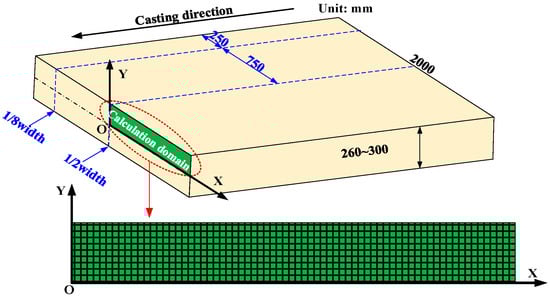 In the present work, the peritectic steel slab produced by a commercial wide-thick continuous caster was taken as the specific research object. Based on some simplified assumptions [], one quarter of the slab transverse section was chosen as the calculation domain to establish the 2D heat transfer model. Four-node rectangular elements with a mesh size of 2 mm × 2 mm were used to discrete the calculation domain, and the final finite element model is shown in Figure 2. During the calculation process, the time step is 0.2 s, and Table 1 lists more detailed parameters about the casting process and the continuous cast.