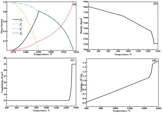 Based on the phase evolution in Figure 3a, the thermal material properties of the research steel, including density, conductivity, and enthalpy, were calculated using weighted phase fraction equations [] and are respectively shown in Figure 3b, Figure 3c, and Figure 3d. With the temperature increase, density in Figure 3b continuously decreases, while conductivity in Figure 3c and enthalpy in Figure 3d present an overall increasing trend. It should be noted that the thermal conductivity of the liquid steel is magnified by 1.5 times compared to that in the solid state when considering the improving effect of molten steel flow on heat conduction of steel [,].