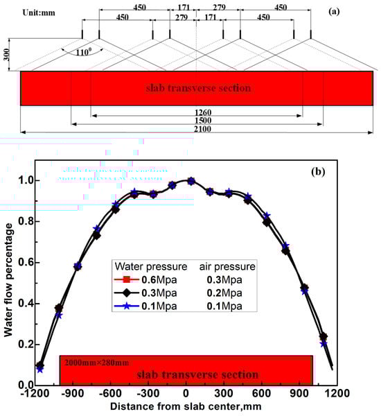 Figure 4. (a) Nozzle arrangement and (b) the corresponding measured water flux distribution along the slab width in zones 5–8. - (ii)