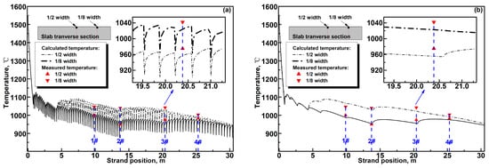In Figure 5, the temperature and shell thickness at 1/8 width of the wide-thick slab are, respectively, higher and thinner than that at 1/2 width due to the continuously declining cooling water flux from the slab surface center to corner as shown in Figure 4b. In Figure 5a, transient slab surface temperature dips can be observed in roll–slab contact regions because the cooling effect of the slab surface is dramatically enhanced in these regions.