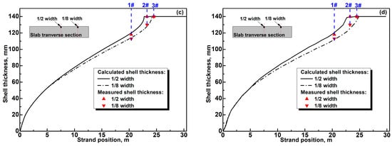 It can be seen from Figure 5a–c that the predicted slab surface temperature using the R. method and E. method and the predicted shell thickness obtained using the R. method agrees well with the measured ones. The maximum absolute value of relative error between the measured slab surface temperature and the predicted ones are less than 1.9% for the R. method and less than 2.6% for the E. method. The maximum absolute value of relative error between the measured shell thickness and the predicted ones obtained using the R. method is less than 1.7%. However, the relative deviation between the measured shell thickness and the predicted ones obtained using the E. method is relatively obvious, and the maximum absolute value of relative error of the predicted shell thickness obtained using the E. method reaches 3.2%.