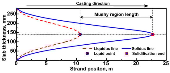 Illustration of the mushy region length and solidification end at the mid-width (1/2 width) plane of a 2000 mm × 280 mm slab produced under a casting speed of 0.8 m/min.