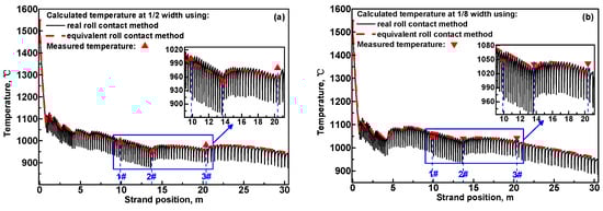 Comparison of the predicted slab surface temperature obtained using different roll contact methods with the measured results at (a) 1/2 width and (b) 1/8 width.