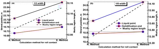 Although both the predicted liquid point and solidification end in Figure 8a,b obtained using the E. method shift along the casting direction compared with that predicted using the R. method, the solidification end shifts more obviously. As a result, the predicted mushy region using the E. method is longer than that predicted using the R. method. Furthermore, the deviation of the predicted solidification end and mushy region length obtained using the E. method are more obvious at 1/8 width plane of the wide-thick slab compared with that at 1/2 width. This is mainly caused by two factors: (1) the higher surface temperature at 1/8 width increases the temperature difference between the slab surface and rolls surface and thus enhances the cooling effect of the rolls; (2) as indicated in Figure 5c,d, the solidification end at 1/8 width is located behind that at 1/2 width due to the continuously declining cooling intensity from the slab surface center to the corner. This leads to the fact that more roll–slab contact regions exist before the solidification end at 1/8 width, which further increases the total heat amount extracted via roll–slab contact.