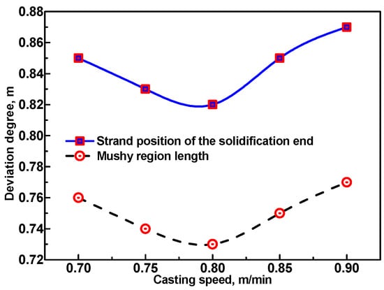 Figure 9 shows the deviation degree (the deviation degree is defined as that the predicted strand position of solidification end or mushy region length obtained using the E. method minus the predicted ones obtained using the R. method) of the predicted results obtained using the E. method and R. method under different casting speeds. It can be seen that the deviation degree of solidification end position are overall larger than the deviation degree of mushy region length, and the variation trend of the deviation degree of these two predicted results obtained using the E. method are similar. With the increase in casting speed, two main factors significantly influence the tendency of the deviation degree: (a) the increase in casting speed dramatically shortens the contact time in each roll–slab contact region, which helps to decrease the deviation degree of the predicted results obtained using the E. method which is caused by neglect of the transient temperature dips in roll–slab contact regions. (b) However, with the increase in casting speed, the solidification end subsequently moves along the casting direction, and thus the mushy region length simultaneously increases. This means more roll–slab contact regions exist before the strand solidification end, which tend to enlarge the deviation degree of the predicted results obtained using the E. method. In Figure 9, with the increase in casting speed, the deviation degree first shows a decreasing tendency between 0.7 m/min and 0.8 m/min and then continuously increases in the range of 0.8~0.9 m/min. This indicates that the above-mentioned Factor (a) plays a more significant role in influencing the tendency of the deviation degree when the casting speed is in the range of 0.7–0.8 m/min. However, Factor (b) influences the variation of the deviation degree more obviously when the casting speed is in the range of 0.8–0.9 m/min.