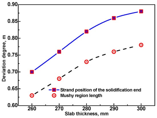 In order to study the influence of slab thickness on the deviation degree of the predicted strand position of solidification end and mushy region length obtained using the E. method and R. method, these two results at 1/8 width plane of the wide-thick slab with different thickness were calculated and compared using the E. method and R. method, respectively. Figure 10 shows the variation of deviation degree with slab thickness. With the increase in slab thickness, the solidification end subsequently moves along the casting direction, and the mushy region length is also increased. This results in more roll–slab contact regions before the strand solidification end and thus tends to enlarge the deviation degree of the predicted results obtained using the E. method and R. method. However, the increase in slab thickness means more heat per unit length of strand to be extracted during the solidification process due to the amount of secondary cooling water increasing correspondingly, which results in a tendency to decrease the ratio of the heat extracted via roll–slab contact. As a result, the increase in slab thickness also has an effect of helping to decrease the deviation degree of the predicted results obtained using the E. method and R. method. Affected more significantly by the former of the two factors mentioned above, both the deviation degree of the predicted solidification end position and mushy region length obtained using the E. method and R. method continuously increase with the increasing slab thickness. However, the increase in the deviation degree continuously grows slower.